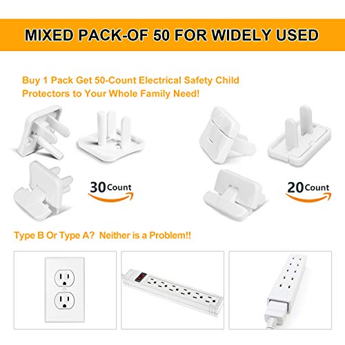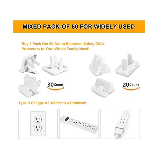 MIXED PACK-OF 50 FOR WIDELY USED- For the convenience use of the majority of US families, Babepai especially offer you the favorable mixed set of package: 30 pieces 3 prong outlet plugs cover for type B plus 20 pieces 2 prong outlet plugs for type A. Yes! From Babepai, you can buy 1 pack and get 50 pieces excellent and new design electrical safety child protector to your whole family need!