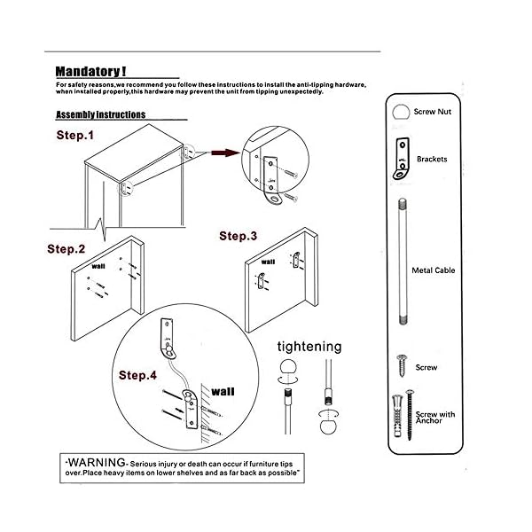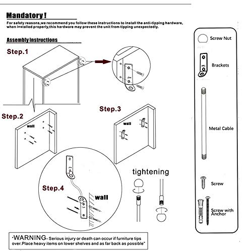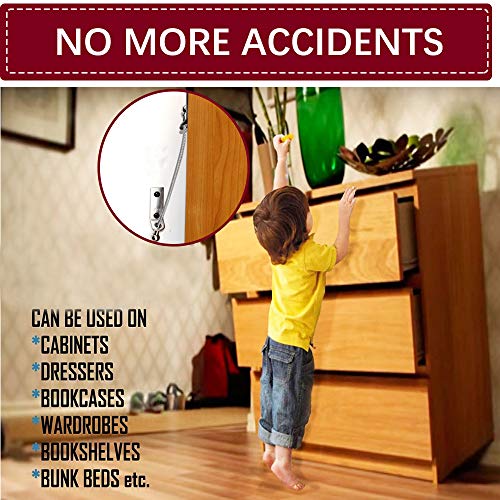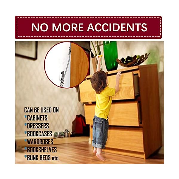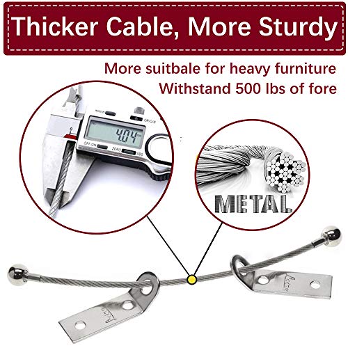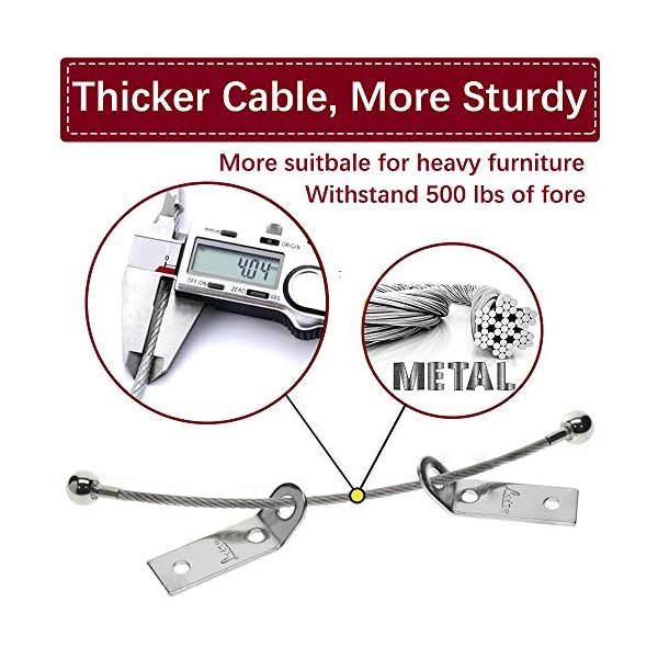 【THICKER CABLE, MORE STURDY】3/19”(4mm) thick steel furniture cable, make this anti-tip kit can hold maximum 500lbs weight furniture. Keep furniture upright during earthquakes, windstorms. And protect children from furniture tip-overs hurt.