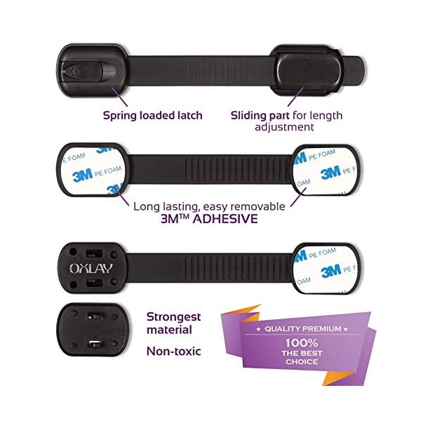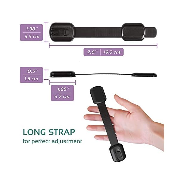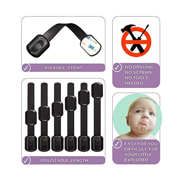 Easy to install child safety locks, no tools needed, each cabinet locks child safety set contains extra adhesive foam tape to prolong the life of your babyproof cabinet locks; the child proofing locks have a long strap making these babyproofing latches a versatile baby safety solution