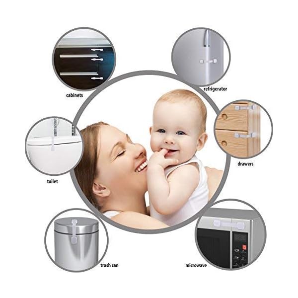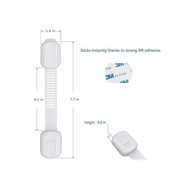 ADJUSTABLE LOCK WITH MULTI PURPOSE USE; Prevent your little ones from reaching to kitchen cabinets, drawers, door, window, refrigerator, oven, freezer, toilet seat, fridge, trash can, washing machine, electric appliances and make them stay out of trouble as they can’t get sharp items such as knives and scissors. Safety latch system works both on flat surfaces and round corners. Can be adjusted to the desired length from 7.7 to 4.1 inches and can be placed both vertically and horizontally.