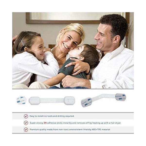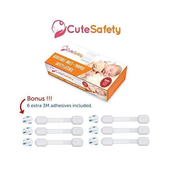 CUTESAFETY CHILD PROOF SAFETY CABINET LOCKS WITH 6 EXTRA 3M TAPES; Unlike many similar products in the market, our baby proofing safety cabinet locks are made from the highest quality ABS and TPE material ensuring more flexibility and durability. Extreme care has been taken to the resilience and durability of the strap. Moreover, each package includes 6 extra 3M adhesive replacement pads at no additional cost allowing to reuse the latch when needed and saving your money.