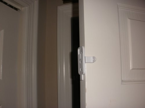 The DoorSmoocher is a child baby and pet safety lock designed to latch single and double sliding pocket doors and swing doors. Ideal for helping protect kids and pet like cats and dogs, the lock can be placed high up, out of the reach. The DoorSmoocher is easy to install, will not damage the door face, and most importantly will help prevent toddlers and your cats and dogs from getting into areas that could be dangerous or that you just want to keep them out of. The product is a great alternative to damaging hook and eye hardware or putting an expensive baby gate in the doorway. Fits standard size interior doors up to 1 1/2 inches. Requires placement of 2 screws in door and 2 in door frame but will not damage face of door. The DoorSmoocher will lock the door and your existing lock may not work while the Door Smoocher is installed. Your pocket door will recess all the way back except for about 1″.