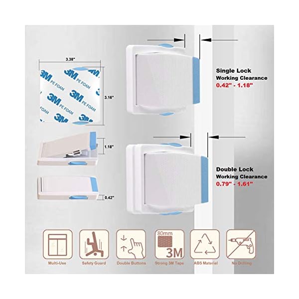 SAFE DESIGN – Unlike other sliding glass door lock, this sliding door child lock is installed beside door shelf and works once double buttons pressed simultaneously, which stops the door slided and passed each other. This lock is off to press the locking cover for unlock condition!