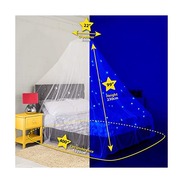 ✨ SLEEP AMONGST THE STARS AND STAY PROTECTED – Oh yes! This enchanting bed canopy can be used as insect netting, crib mosquito net as well as a centrepiece home décor at the same time. Generous amount of netting provides full coverage. Measurements: 56cm/22 inches, 1020cm/402 inches, 230cm/90 inches. Easy installation (hook provided). Just hang and be ready to be star dazzled at night 🤩
