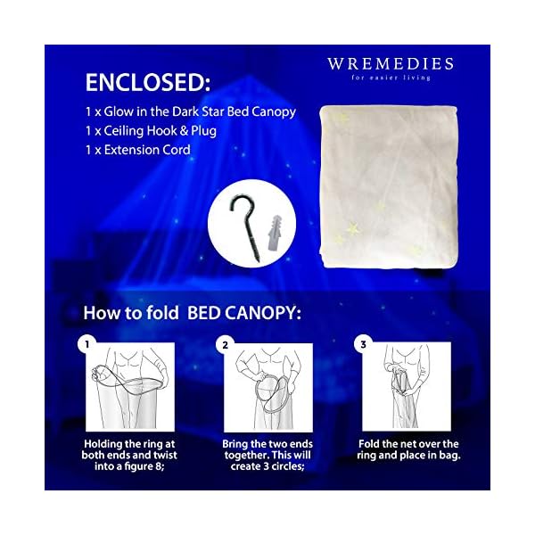 🌟NO MORE SCARED OF THE DARK – Is your child afraid of the dark? Not anymore. Say good-bye to night lights for kids! Watch as the room glow with a cascade of floating stars around the bed. Wremedies glow in the dark canopy bed net will create magical night time glow and encourage your child to sleep without a night light.