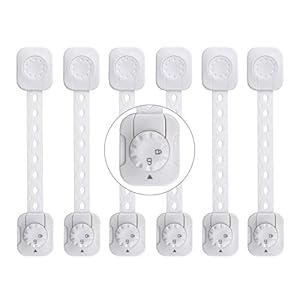 PREMIUM MATERIALS: Made of eco-friendly and durable ABS material, the baby safety cabinet locks are 100% non-toxic and safe for kids. The U-shaped latch is adjustable to fit different distances between handles (max width 4.92’’).SKU: n/a - Cabinet Locks & Straps